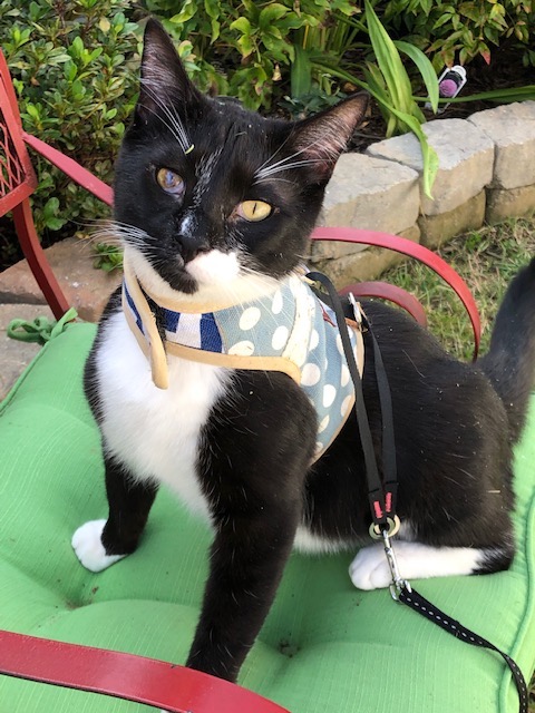 Zach’s kingdom is my fenced yard, from which he has no desire to escape. I planned to take him out for walks, so I leash trained him as a kitten, which turned out to be a good thing. More to come on that. But when it was time to venture out for a real walkabout? Nope, he wasn’t having it. So the vest and leash went on the shelf. But it came in very handy while my bird parents were nesting. Zach suited up in his ‘uniform’ twice a day, morning and evening, and we went into the little garden kingdom, with me holding him in check with the leash. This kept the birds safe but gave Zach the excitement of watching the birds and smelling the fresh air. It also gave me the joy of watching the bird journey.